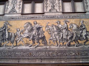 Das Foto gehört zur Serie "Dresdener Fürstenzug". Es zeigt den abschnitt 1228 bis 1349 - Albrecht II., Friedrich der Gebissene, Friedrich der Ernsthafte. Der Fürstenzug in Dresden ist das Bild eines Reiterzuges, aufgetragen auf rund 23.000 Fliesen aus Meißner Porzellan auf der Außenwand des Stallhofs in der Augustusstraße. Das 102 Meter lange Kunstwerk stellt die Ahnengalerie der zwischen 1127 und 1873 in Sachsen herrschenden Markgrafen, Herzöge, Kurfürsten und Könige aus dem Geschlecht des Fürstenhauses Wettin dar. Es gelten die Nutzungsbedingungen der Mediothek und Pixiothek.