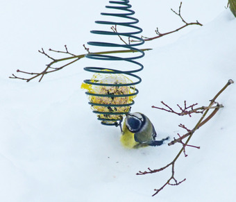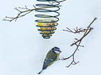 Das Foto gehört zur Serie "Vögel im Winter". Es zeigt eine Blaumeise an der Futterspirale. Es gelten die Nutzungsbedingungen der Mediothek und Pixiothek.