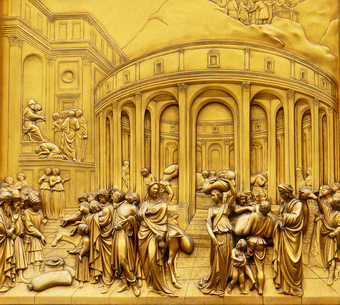 Das Foto gehört zur Serie "Paradiestür am Baptisterium von Florenz". Es zeigt Joseph und Benjamin, ein Bronzerelief von Lorenzo Ghiberti. Es ist rechts in der dritten Reihe der zehn Bildtafeln in seine Paradiestür (auch Paradiespforte genannt) eingebunden. Es gelten die Nutzungsbedingungen der Mediothek und Pixiothek.