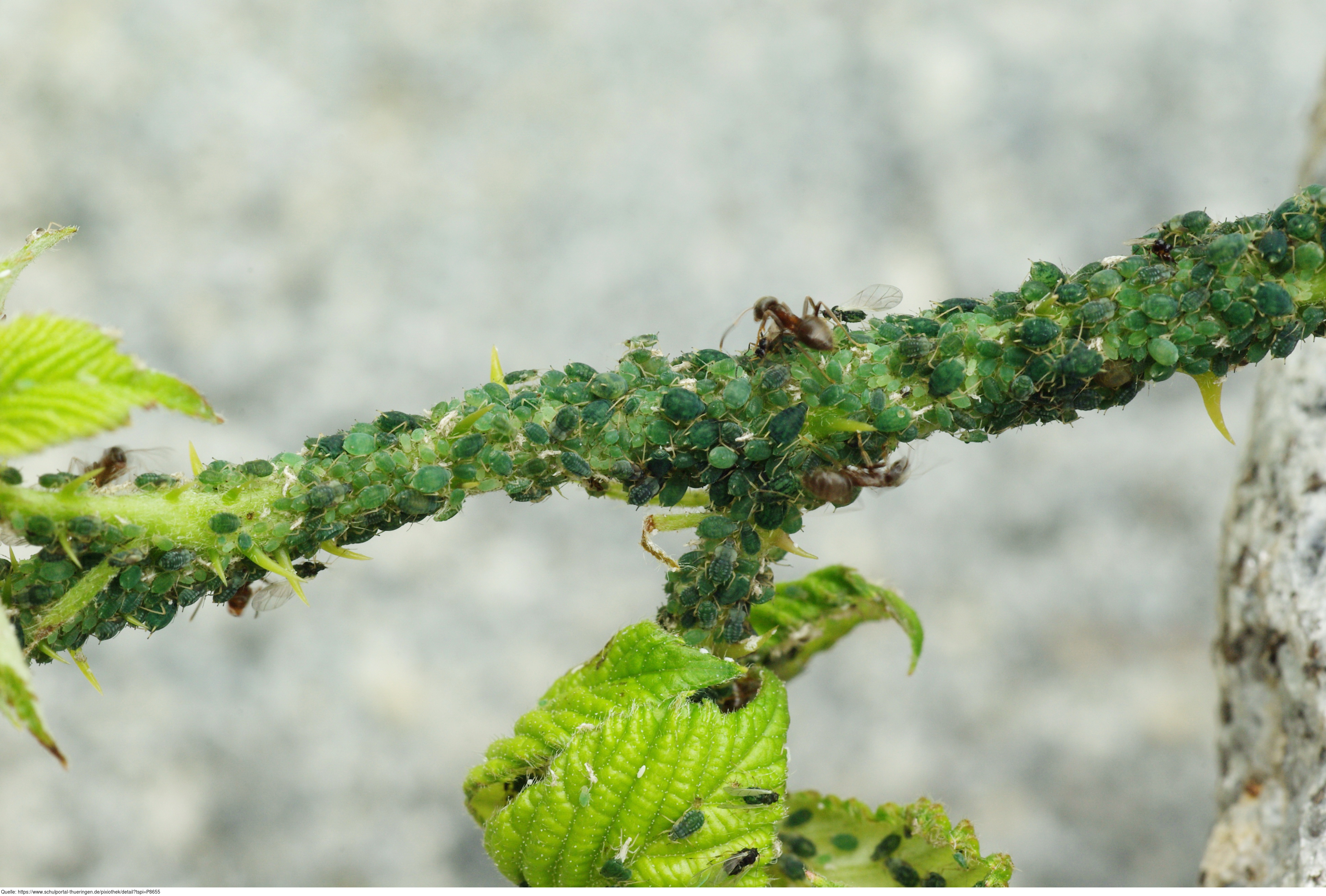 Das Foto gehört zur Serie "Schädlinge von Nutzpflanzen". Es zeigt einen Ast mit Blattläusen (Aphidoidea). Blattläuse ernähren sich von Pflanzensaft. Das Bild ist unter CC0 lizenziert und kann somit frei verwendet werden.