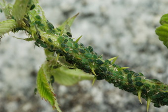 Das Foto gehört zur Serie "Schädlinge von Nutzpflanzen". Es zeigt einen Ast mit Blattläusen (Aphidoidea). Blattläuse ernähren sich von Pflanzensaft. Das Bild ist unter CC0 lizenziert und kann somit frei verwendet werden.