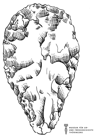 Das Bild gehört zur Serie "Zeichnungen Steinzeit - Museum für Ur- und Frühgeschichte Thüringens". Abgebildet ist ein Faustkeil als ein typisches Steinwerkzeug. Es gelten die Nutzungsbedingungen der Mediothek und Pixiothek.
