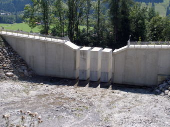 Das Bild gehört zur Serie "Alpen". Es zeigt eine Mauer aus Beton, die zum Schutz vor Muren errichtet wurde (Mure: schnell talwärts fließender Strom aus Schlamm und groben Gestein im Gebirge). Das Bild ist unter CC0 lizenziert und kann somit frei verwendet werden.