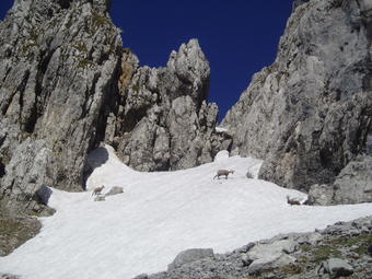 Das Bild gehört zur Serie "Alpen". Es zeigt Gämsen im Gebirge. Das Bild ist unter CC0 lizenziert und kann somit frei verwendet werden.