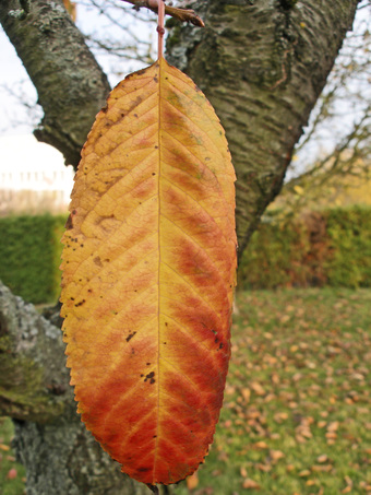 Das Bild gehört zur Serie "Blätter von Laubbäumen". Es zeigt das Blatt eines Kirschbaumes im Herbst. Das Bild ist unter CC0 lizenziert und kann somit frei verwendet werden.