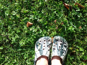 Das Bild zeigt die Füße eines Kindes, das mit Gartenschuhen im Rasen stehen. Das Bild ist unter CC0 lizenziert und kann somit frei verwendet werden.