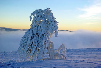 Das Bild gehört zur Serie "Winterlandschaft". Es zeigt einen verschneiten Baum mit Nebel im Tal. Das Bild ist unter CC0 lizenziert und kann somit frei verwendet werden.