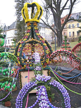 Das Foto gehört zur Serie "Ostern". Es zeigt die Osterkrone in Berga/Elster. 2015 bestand diese Dekoration aus über 15000 bemalten Eiern. Das Bild ist unter CC0 lizenziert und kann somit frei verwendet werden.