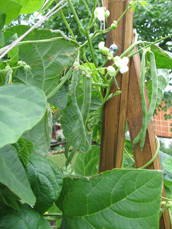 Das Foto gehört zur Serie "Gemüse". Es zeigt Pflanzen der Gartenbohne. Gartenbohnen, die unbegrenzt wachsen und sich dabei stark winden, bekommen vom Gärtner Stangen als Rankhilfen (Stangenbohnen). Das Bild ist unter CC0 lizenziert und kann somit frei verwendet werden.